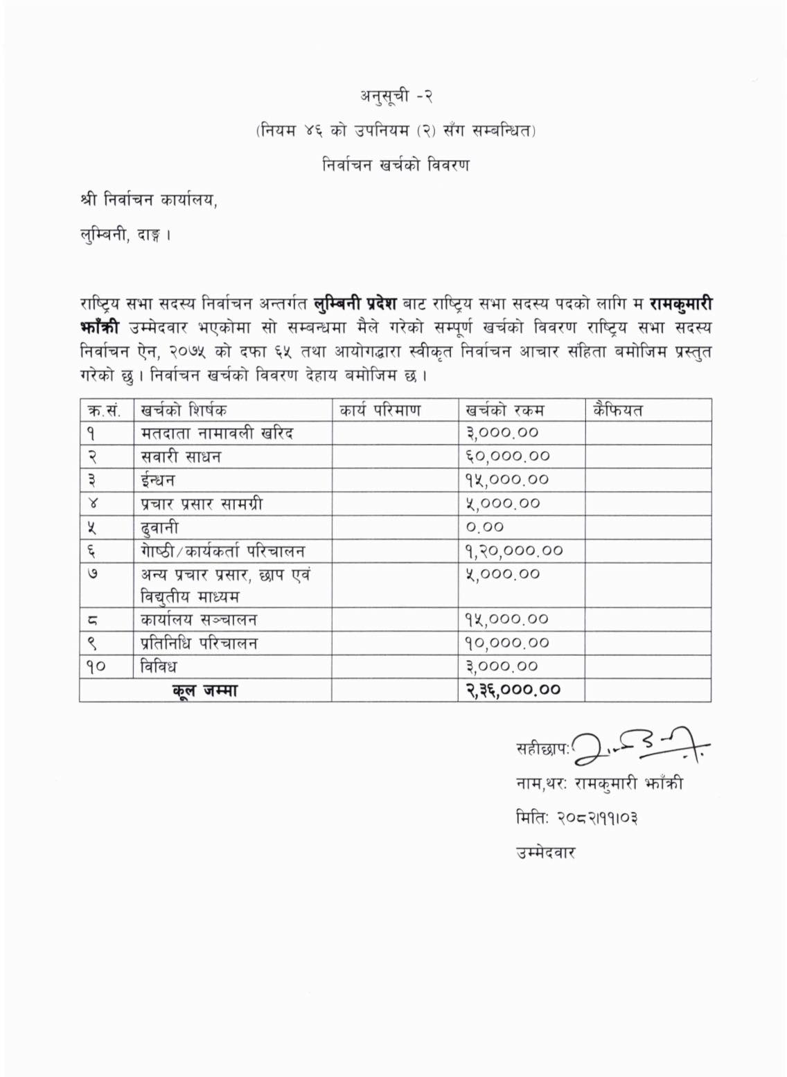 काठमाडौं । एमालेबाट राष्ट्रिय सभा सदस्य निर्वाचित रामकुमारी झाक्रीले चुनावको खर्च विवरण सार्वजनिक गरेकी छन्।