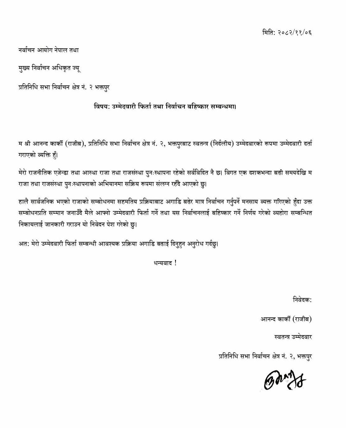 हालै राजाको सम्बोधनमा सहमतिय प्रक्रियाबाट अगाडि बढेर मात्र निर्वाचन गर्नुपर्ने मनसाय व्यक्त गरिएको हुँदा उक्त सम्बाेधनप्रति सम्मान जनाउँदै आफ्नो उम्मेदवारी फिर्ता लिने निर्णय गरेको उनले बताएका छन् ।