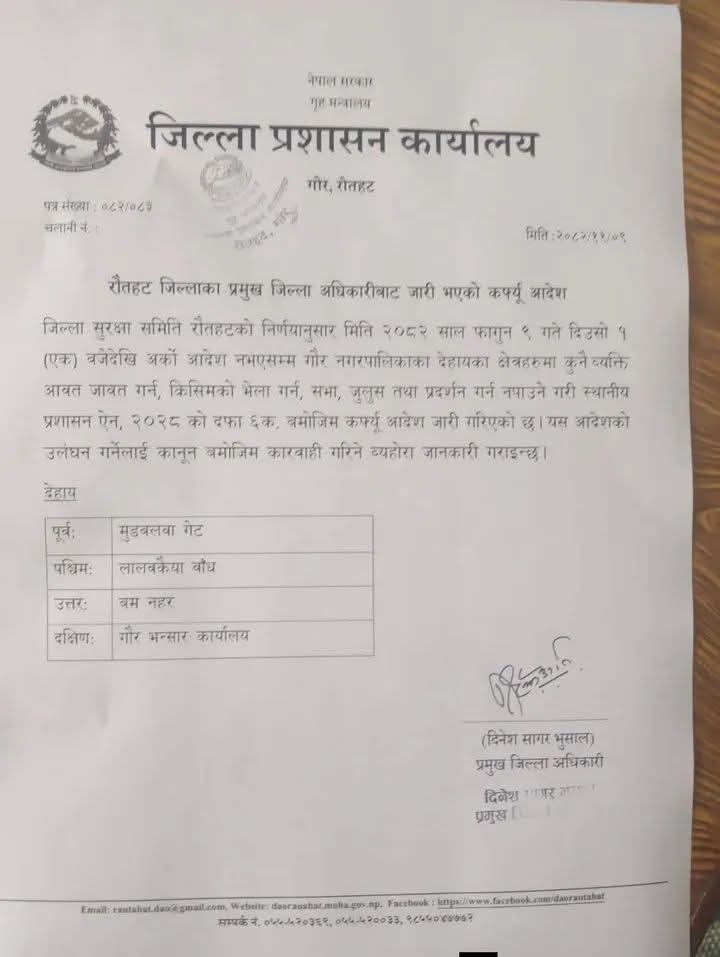 रौतहट । जिल्ला प्रशासन कार्यालय रौतहटले गौर–६ क्षेत्रका केही स्थानमा निषेधाज्ञा जारी गरेको छ।