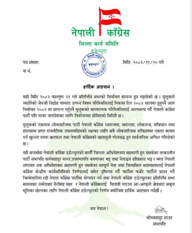 यही फागुन २१ गते प्रतिनिधि सभा निर्वाचन सम्पन्न हुन लाग्दा नेपाली कांग्रेस डडेल्धुराले सबै मतदातालाई सक्रिय रूपमा मतदानमा भाग लिन र पार्टीलाई समर्थन गर्न आह्वान पनि गरेको छ ।