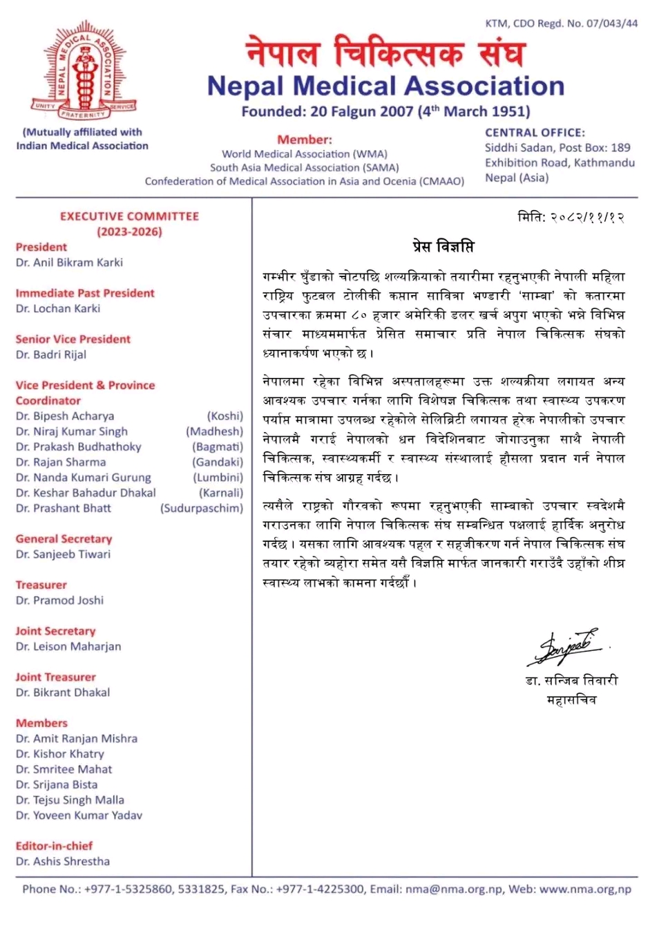 काठमाडौं । नेपाल चिकित्सक संघले राष्ट्रिय महिला फुटबल टोलीकी कप्तान सावित्रा भण्डारी ‘साम्बा’को घुँडाको शल्यक्रिया नेपालमै सम्भव रहेको जनाएको छ।