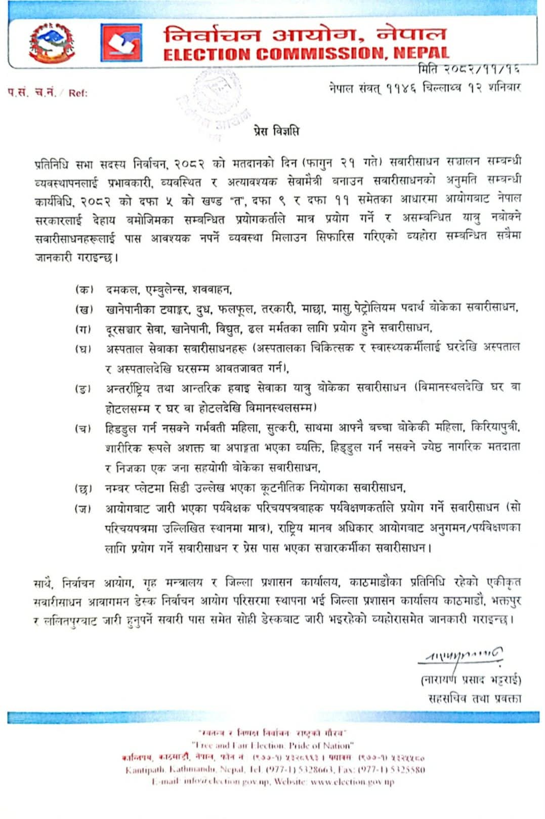 त्यसैगरी, हिँड्डुल गर्न नसक्ने गर्भवती, सुत्करी, साथमा आफ्नै बच्चा बोकेकी महिला, किरियापुत्री, शारीरिक रूपले अशक्त वा अपाङ्गता भएका व्यक्ति, हिँड्डुल गर्न नसक्ने ज्येष्ठ नागरिक वा मतदाता र निजका एक जना सहयोगी बोकेका सवारीसाधन, नम्बर प्लेटमा सिडी उल्लेख भएका कूटनीतिक नियोगका सवारीसाधन, आयोगबाट जारी भएका पर्यवेक्षक परिचयपत्रवाहक पर्यवेक्षणकर्ताले प्रयोग गर्ने सवारीसाधन (सो परिचयपत्रमा उल्लिखित स्थानमा मात्र), राष्ट्रिय मानव अधिकार आयोगबाट अनुगमन/पर्यवेक्षणका लागि प्रयोग हुने सवारीसाधन र प्रेस पास भएका सञ्चारकर्मीका सवारीसाधनका लागि पनि पास आवश्यक नपर्ने आयोगले विगले जनाएको हो ।