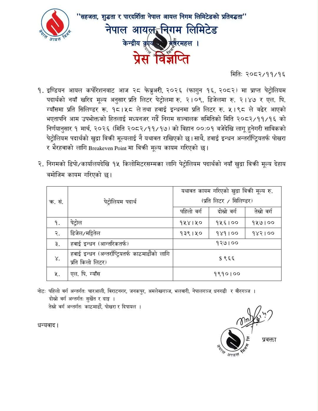 निगमका अनुसार फागुन १६ गते प्राप्त नयाँ खरिद मूल्यसूचीअनुसार पेट्रोल, डिजेल र एलपी ग्यासको मूल्य बढेर आएको छ ।