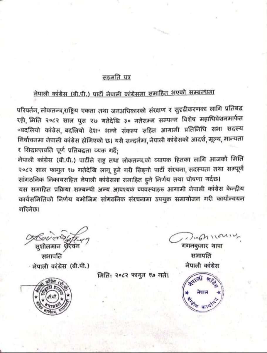 सम्झौतापत्रमा नेपाली कांग्रेसका सभापति गगनकुमार थापा र नेपाली कांग्रेस (बीपी)का सभापति सुशीलमान शेरचनले हस्ताक्षर गरेका छन् ।