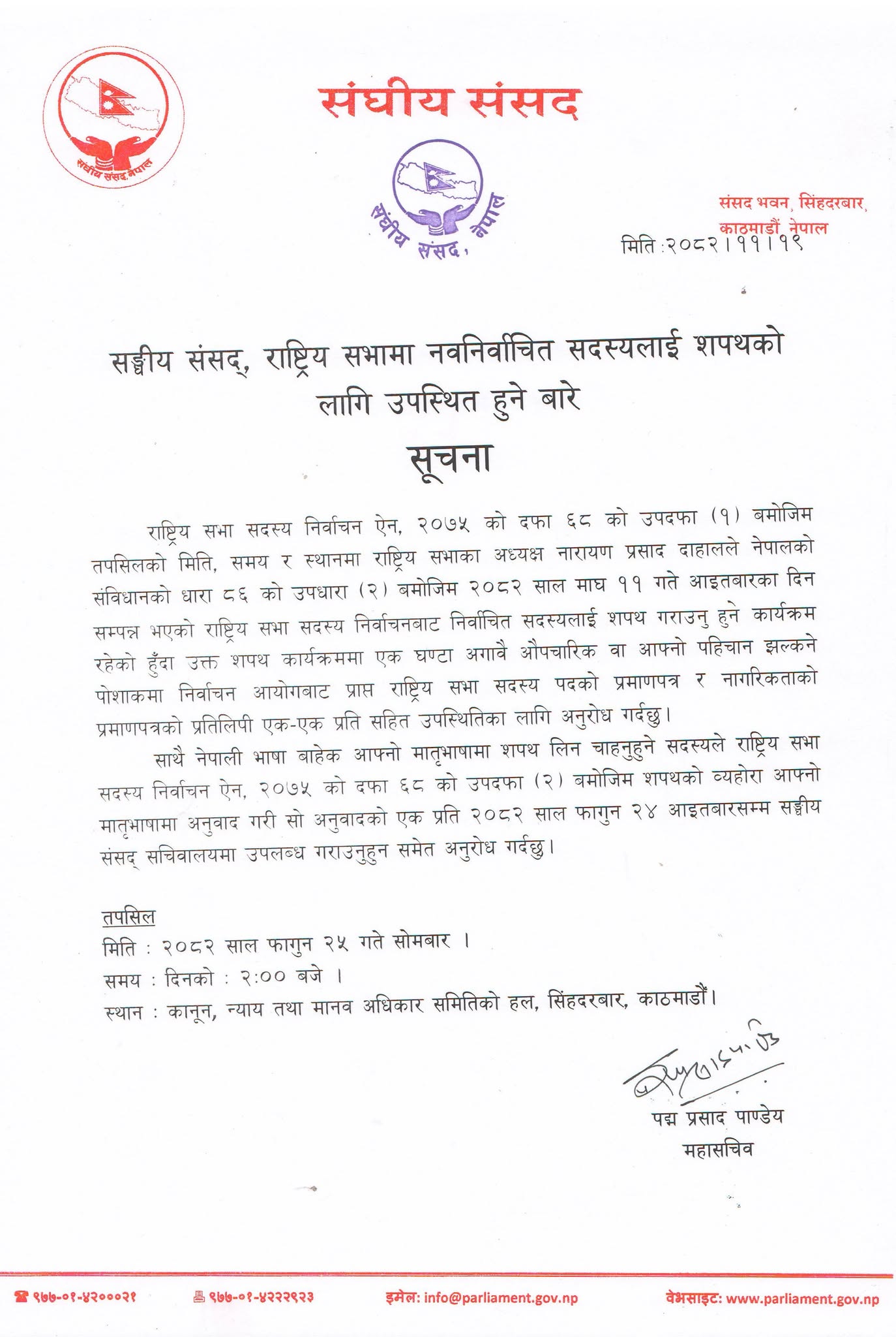 संघीय संसद् सचिवालयका प्रवक्ता सहसचिव एकराम गिरीले फागुन २५ गते दिउँसो २ बजे सिंहदरबारस्थित कानुन न्याय तथा मानवअधिकार समितिको हलमा हुने जानकारी दिए ।