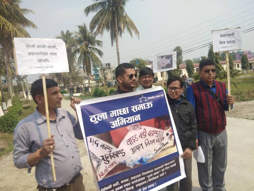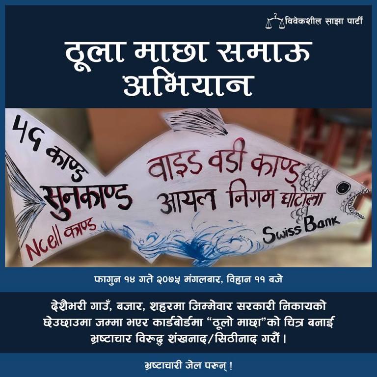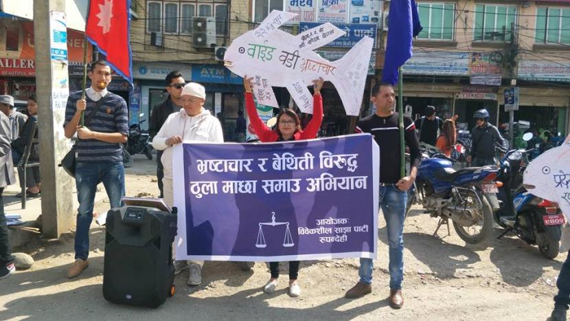 काठमाडौं, १४ फागुन – विवेकशील साझा पार्टीले भर्खरै शुरू गरेको भ्रष्टाचार विरोधी अभियान अन्तर्गत मंगलबार देशका विभिन्न ठाउँमा पार्टीका नेता तथा शुभेच्छुकहरूले प्रदर्शन गरेका छन्।