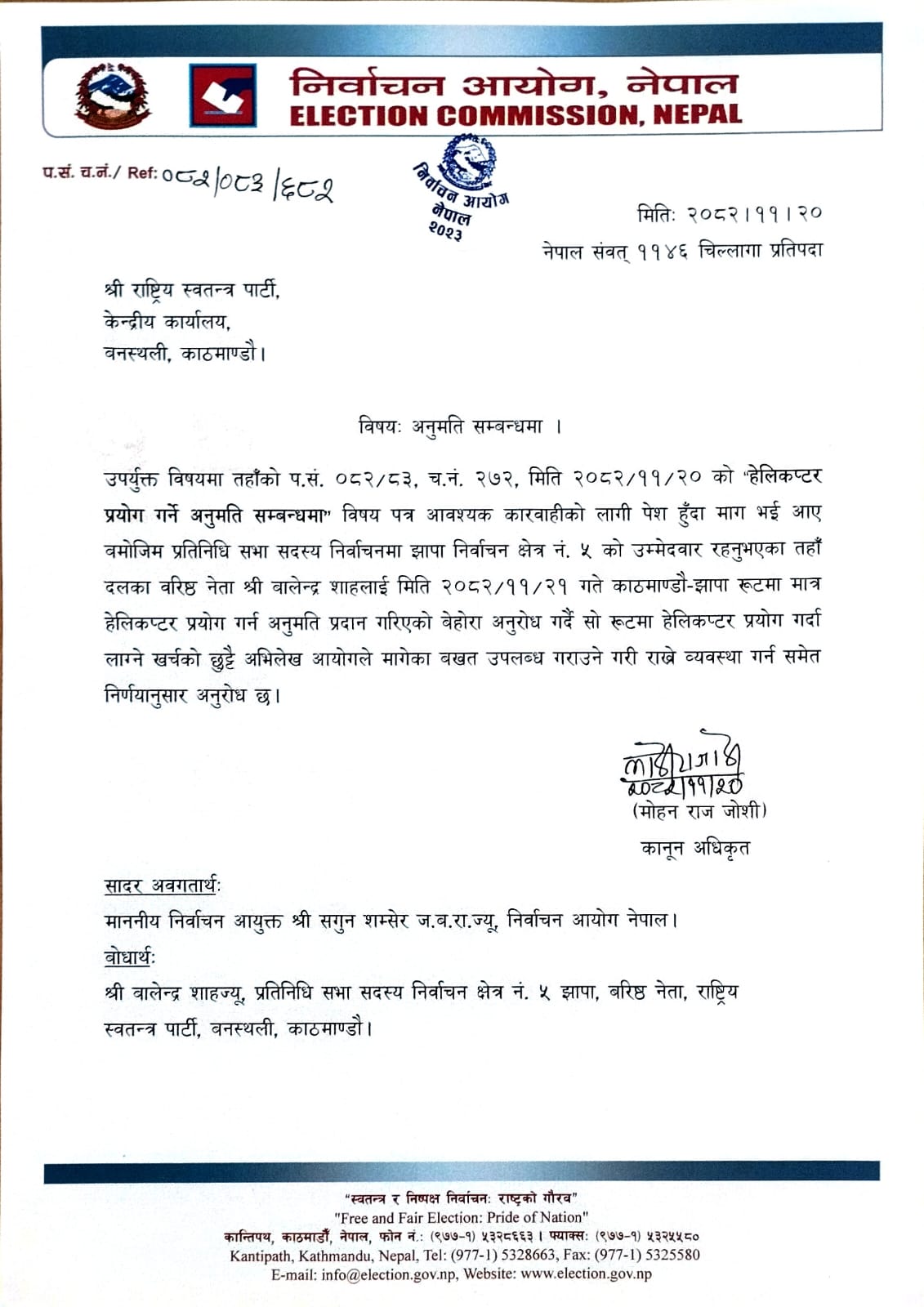 निर्वाचन आयोगमा अनुमति माग भएकोमा हेलिकप्टर प्रयोग वापतको खर्चको विवरण छुट्टै राख्ने गरी अनुमति दिएको थियो । आज बिहान बालेन चढेको हेलिकप्टर झापामा गएपनि सुरक्षा संयन्त्रले अवतरणमा गर्दा सुरक्षा थ्रेट देखेसँगै ओखलढुंगाबाट फर्किएको जनाएको छ ।