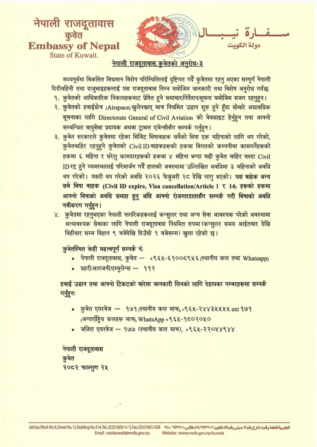 “कुवेत सरकारले कुवेतमा रहेका भिजिट भिसावाहक सबैको भिसा एक महिनाको लागि थप गरेको, कुवेतबाहिर रहनुहुने कुवेतको सिभिल आईडीवाहकहरूको हकमा विगतको कम्पनीमा काम गर्नेहरूको हकमा ६ महिना र घरेलु कामदारहरूको हकमा चार महिनाभन्दा बढी कुवेत बाहिर बस्दा सिभिल आईडी/दुई हुने व्यवस्थालाई परिमार्जन गर्दै हालको अवस्थामा उल्लिखित अवधिमा तीन महिनाको अवधि थप गरेको,” कुवेतस्थित नेपाली दूतावासले जारी गरेको विज्ञप्तिमा भनिएको छ ।