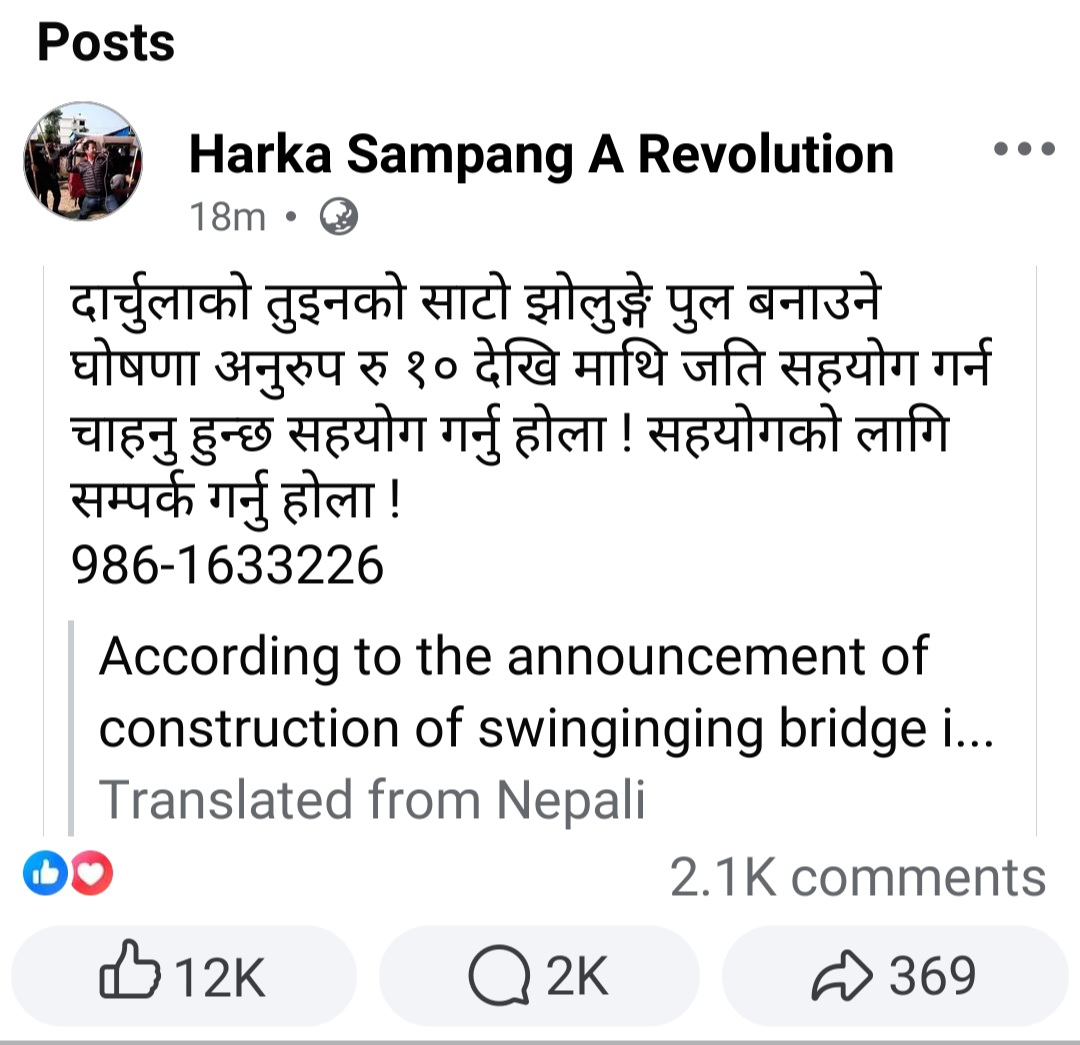 सोमबार सामाजिक सञ्जाल मार्फत उनले तुइनको साटो झोलुङ्गे पुल बनाउने घोषणा गर्दै सहयोगको अपिल गरेका छन् ।