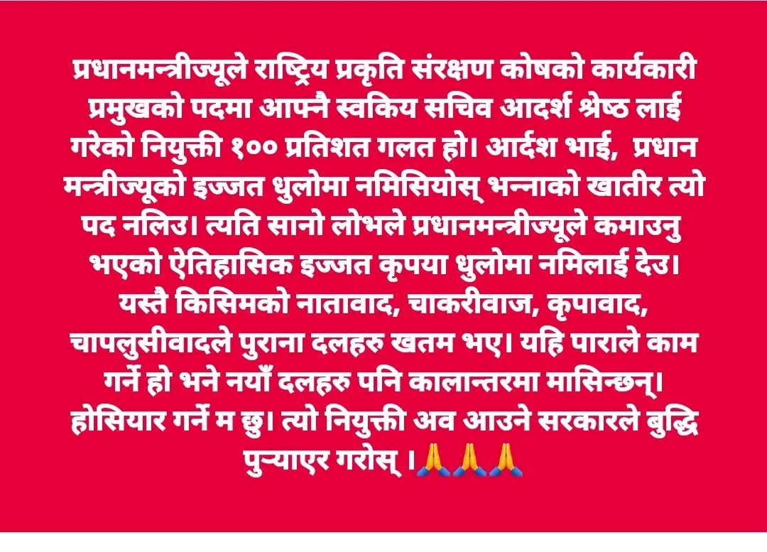 प्रधानमन्त्रीले आफ्नै स्वकीय सचिव आदर्शकुमार श्रेष्ठलाई कोषको अध्यक्षमा नियुक्त गरेपछि पुनले सामाजिक सञ्जालमार्फत यस्तो प्रतिक्रिया दिएका हुन् ।