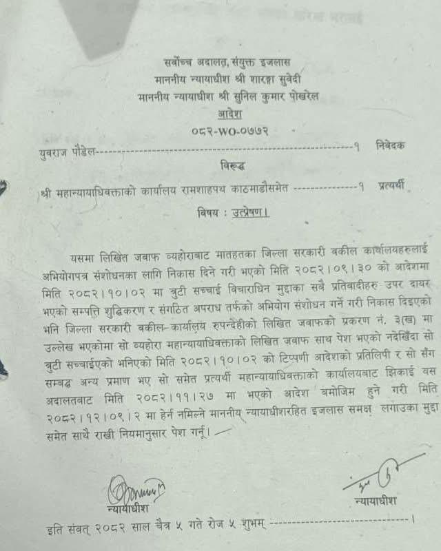 काठमाडौँ । सर्वोच्च अदालतले रवि लामिछानेको अभियोग पत्र संशोधनका लागि दिइएको निर्देशन र सोसँग सम्बन्धित कागजातहरू महान्यायाधिवक्ताको कार्यालयबाट झिकाउन आदेश दिएको छ।