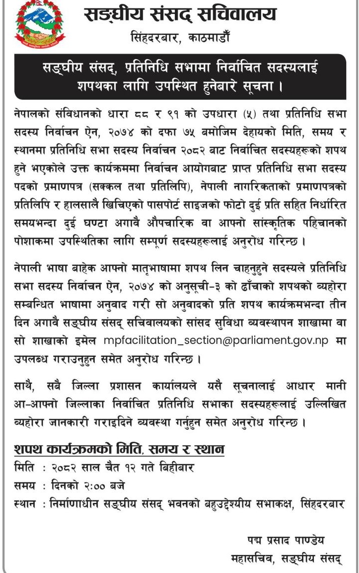 काठमाडौँ । फागुन २१ को प्रतिनिधिसभा सदस्य निर्वाचनमा नवनिर्वाचित सांसदलाई शपथ ग्रहणमा उपस्थित हुन संघीय संसद सचिवालयले सार्वजनिक सूचना जारी गरेको छ । नवनिर्वाचित सांसदहरूको शपथ चैत १२ गते बिहीबार दिउँसो २ बजे सिंहदरबारस्थित निर्माणाधीन संघीय संसद् भवनको बहुउद्देश्यीय सभाकक्षमा हुनेछ।