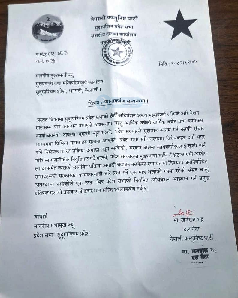 धनगढी । सुदूरपश्चिम प्रदेश सभा अधिवेशन तत्काल आह्वान गर्न मुख्यमन्त्रीलाई ध्यानाकर्षण गराएको छ। प्रमुख प्रतिपक्ष दल नेपाली कम्युनिष्ट पार्टी (नेकपा) ले सुदूरपश्चिम प्रदेश सरकारमाथि कुशासन, कमजोर कार्यसम्पादन र पारदर्शिताको अभाव रहेको आरोप लगाउँदै प्रदेश सभा अधिवेशन तत्काल आह्वान गर्न मुख्यमन्त्री कमलबहादुर शाहलालाई ध्यानाकर्षण गराएको हो।