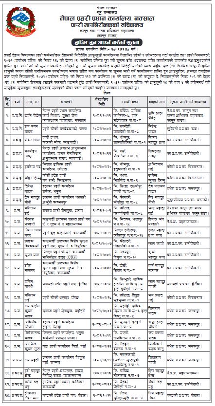 काठमाडौं । नेपाल प्रहरीले लामो समयदेखि गैरहाजिर रहेका २४ जना कर्मचारीलाई सात दिनभित्र कार्यालयमा हाजिर हुन निर्देशन दिएको छ। मंगलबार प्रहरी प्रधान कार्यालयले सार्वजनिक सूचना जारी गर्दै आफूखुसी गैरहाजिर रहेका कर्मचारीहरूलाई तुरुन्त सम्पर्कमा आउन आग्रह गरेको हो ।