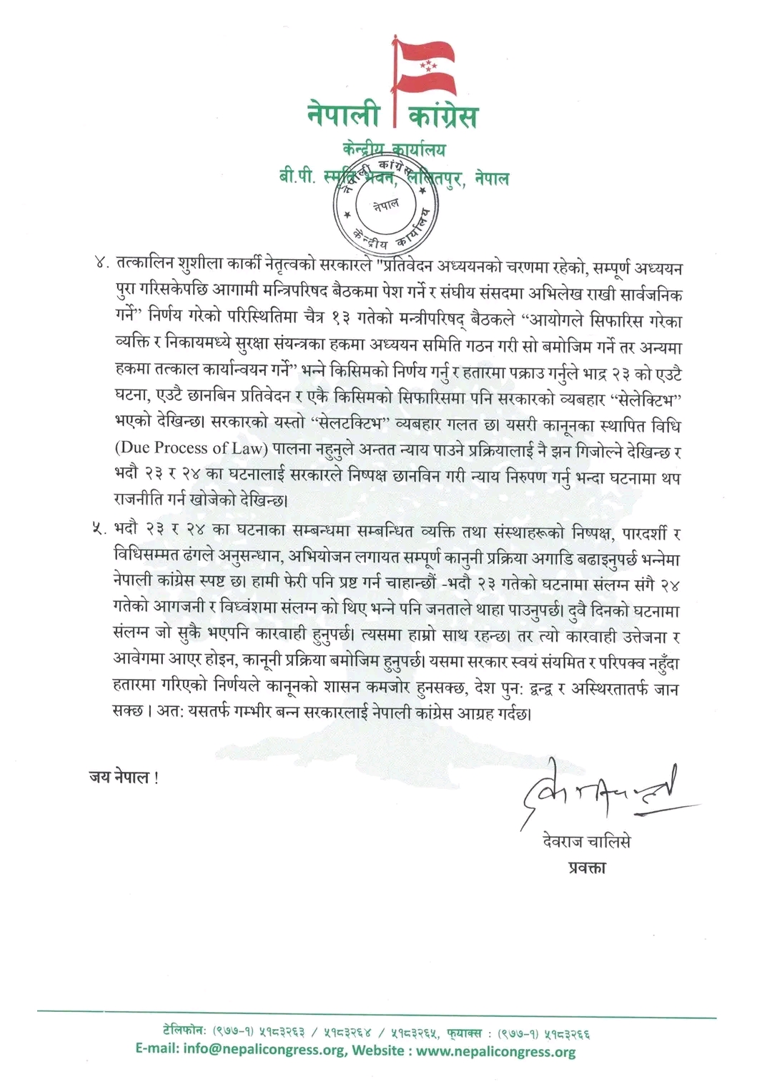 भदौ २३ र २४ को घटनामा संलग्न जो सुकै भएपनि कारबाही हुनुपर्ने र त्यसमा पार्टीको सहयोग रहने कांग्रेसको धारणा छ ।