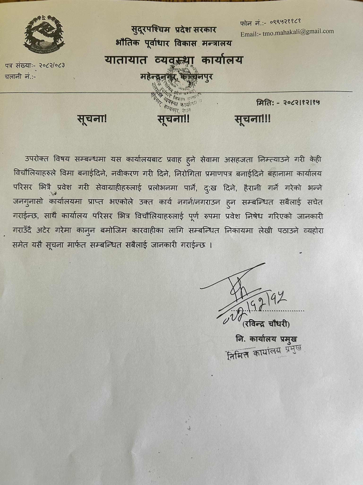 यस्ता धेरै भिडभाड हुने सरकारी कार्यालयमा बिचौलियाकै कारण सर्वसाधारणले सास्ती तथा लुटिने कार्य बढ्दै आइरहेको थियो । अब भने बिचौलियालाई निषेध गरेपछि सेवाग्राहीलाई सहज हुने अपेक्षा गरिएको छ । यातायात व्यवस्था कार्यालय महेन्द्रनगरले एक सूचना जारी गर्दै कार्यालय परिसरभित्र बिचौलियाको प्रवेश पूर्ण रूपमा निषेध गरेको जानकारी दिएको छ ।कार्यालयले कुनै पनि सेवा लिन बिचौलियाको आवश्यकता नपर्ने र तोकिएको शुल्कबाहेक अतिरिक्त रकम नतिर्न सेवाग्राहीलाई अनुरोध गरेको छ ।