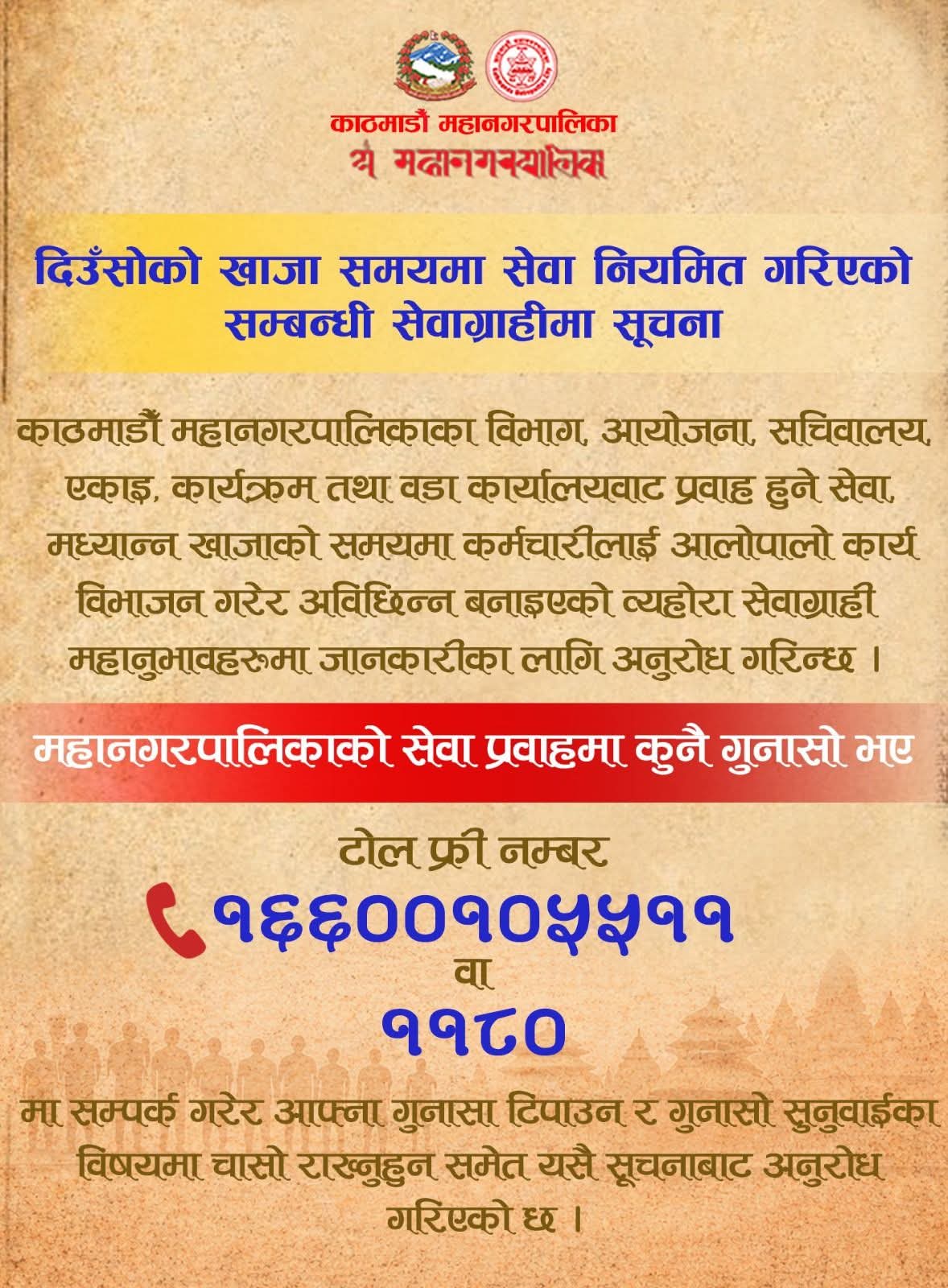 यसैबिच सरकारी कार्यालयमा दिउँसोको खाजा समयमा पनि सेवा नियमित हुन थालेका छन् । काठमाडौँ महानगरपालिकाले एक सचना जारी गर्दै खाजाको समयमा पनि सेवा नियमित भईरहेको जनाएको हो ।