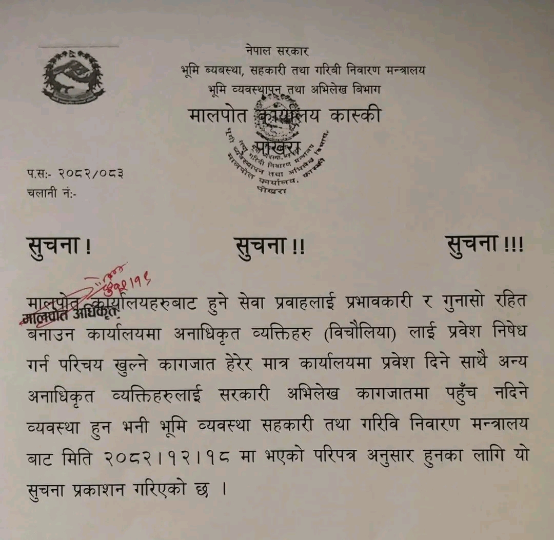 भूमि व्यवस्था, सहकारी तथा गरिबी निवारण मन्त्रालयले भूमिसँग सम्बन्धित सबै कार्यालयमा अनधिकृत व्यक्ति (बिचौलिया) लाई प्रवेश निषेध गर्न निर्देशन दिएपछि मालपोत र नापीमा पनि यो नियम लानुहुन लागेको हो । यो सँगै सरकारी कार्यालयमा बिचौलियाहरुको बिचल्ली हुने निश्चित छ । यसैबिच मालपोत कार्यालय कास्कीले पनि बिचौलियालाई प्रवेश निषेध गरेको छ।