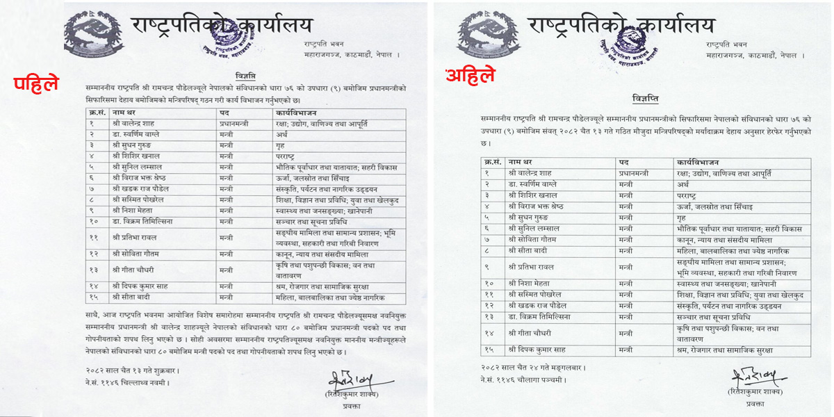 तेह्रौँ वरीयतामा रहेकी कानुनमन्त्री सोविता गौतमलाई सातौँ वरीयतामा ल्याइएको छ।कानुनमन्त्री सोबिता गौतमलाई तेह्रौँ वरीयता मिल्दा कृषि तथा पशुपन्छी विकास र वन तथा वातावरण मन्त्री गीता चौधरीलाई चौधौँ र महिला, बालबालिका मन्त्री सीता वादीलाई अन्तिम वरीयता मिलेको छ।