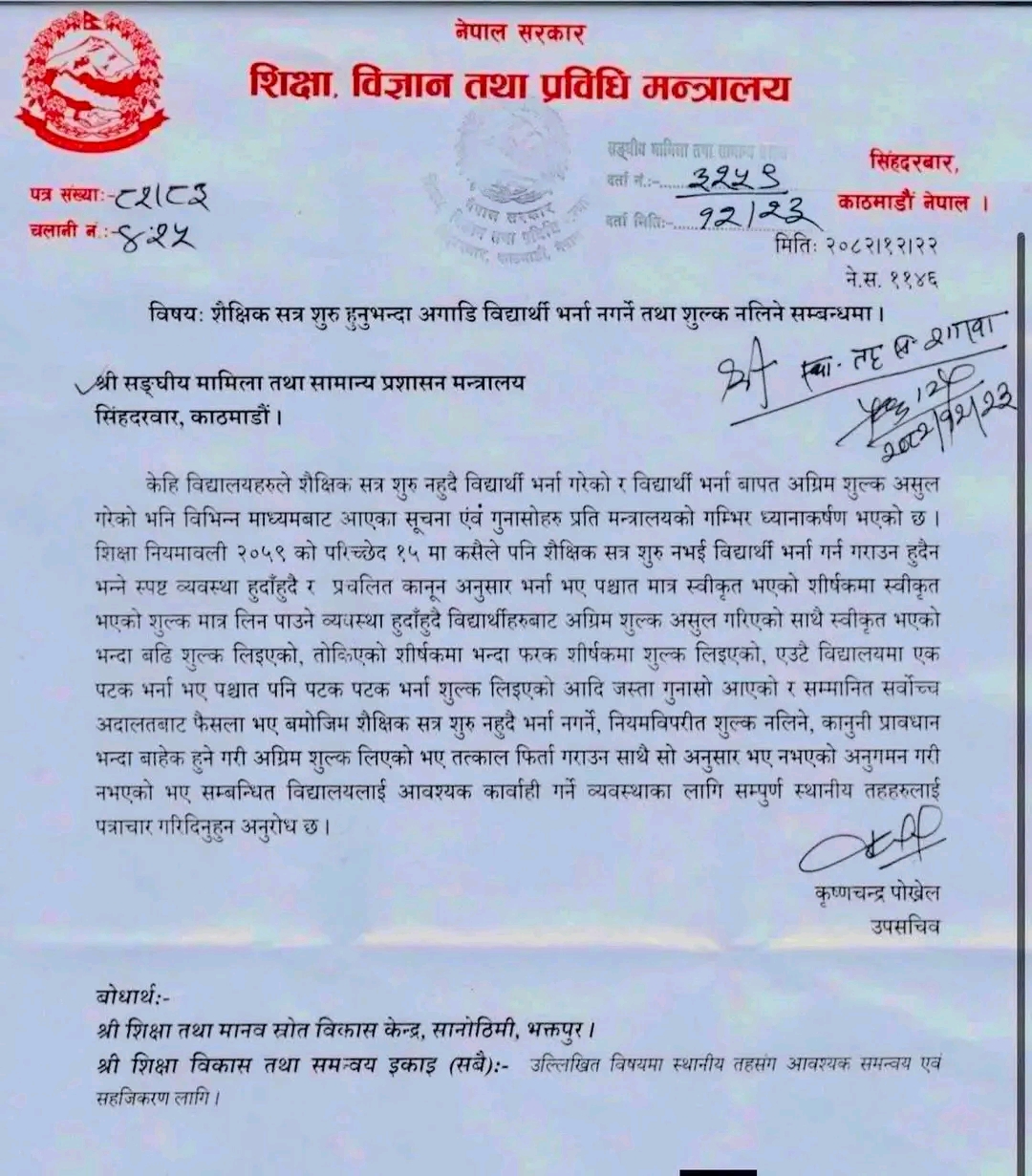 शिक्षा मन्त्रालयले केहि विद्यालयहरुले शैक्षिक सत्र शुरु नहुदै विद्यार्थी भर्ना गरेको र विद्यार्थी भर्ना बापत अग्रिम शुल्क असुल गरेको भनि विभिन्न माध्यमबाट आएका सूचना एंवं गुनासोहरु प्रति मन्त्रालयको गम्भिर ध्यानाकर्षण भएको जनाएको छ ।