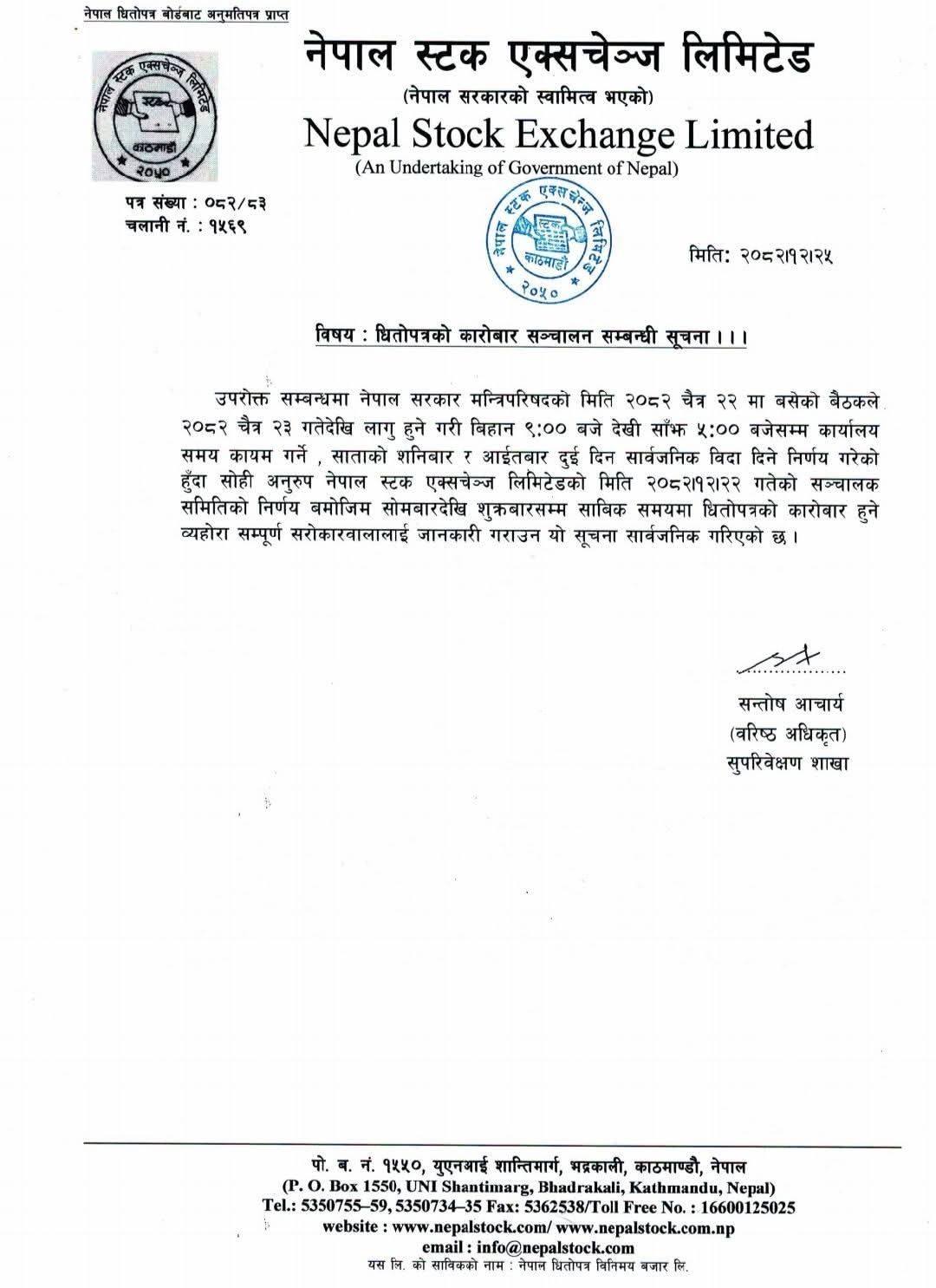काठमाडौं । नेपाल स्टक एक्सचेञ्ज (नेप्से)ले अब सोमबारदेखि शुक्रबारसम्म सेयर कारोबार हुने जनाएको छ । बुधबार नेप्सेले सूचना सार्वजनिक गर्दै मन्त्रिपरिषद्ले २२ गते गरेको निर्णयअनुसार अब सोमबारदेखि शुक्रबारसम्म सेयर कारोबार हुने जनाएको हो ।