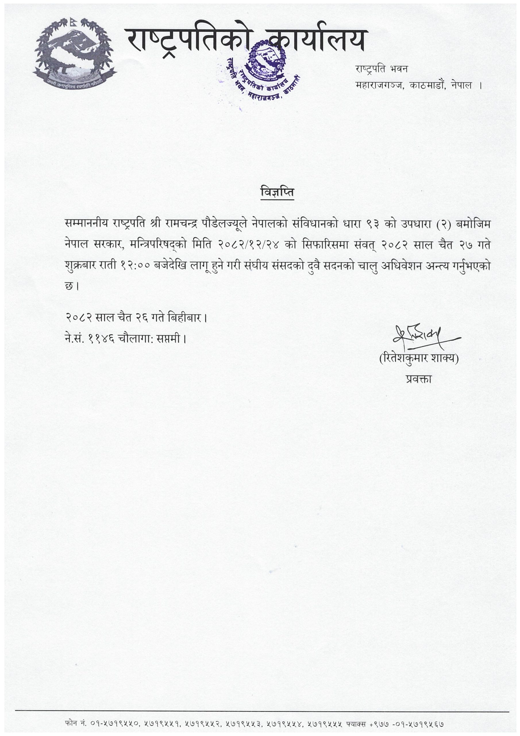 काठमाडौं । संघीय संसद्को दुवै सदनको अधिवेशन भोलिदेखि अन्त्य हुने भएको छ । चैत २४ गतेको मन्त्रिपरिषद्को सिफारिसअनुसार राष्ट्रपति रामचन्द्र पौडेलले दुवै सदनको अधिवेशन अन्त्य गरेका हुन् । राष्ट्रपति कार्यालयका अनुसार अधिवेशन अन्त्य शुक्रबार राति १२ बजेदेखि लागू हुनेछ ।