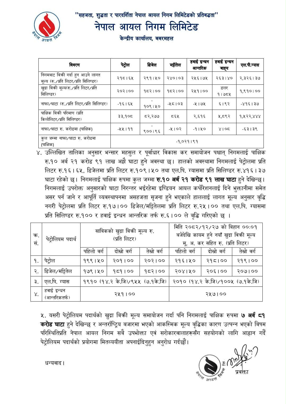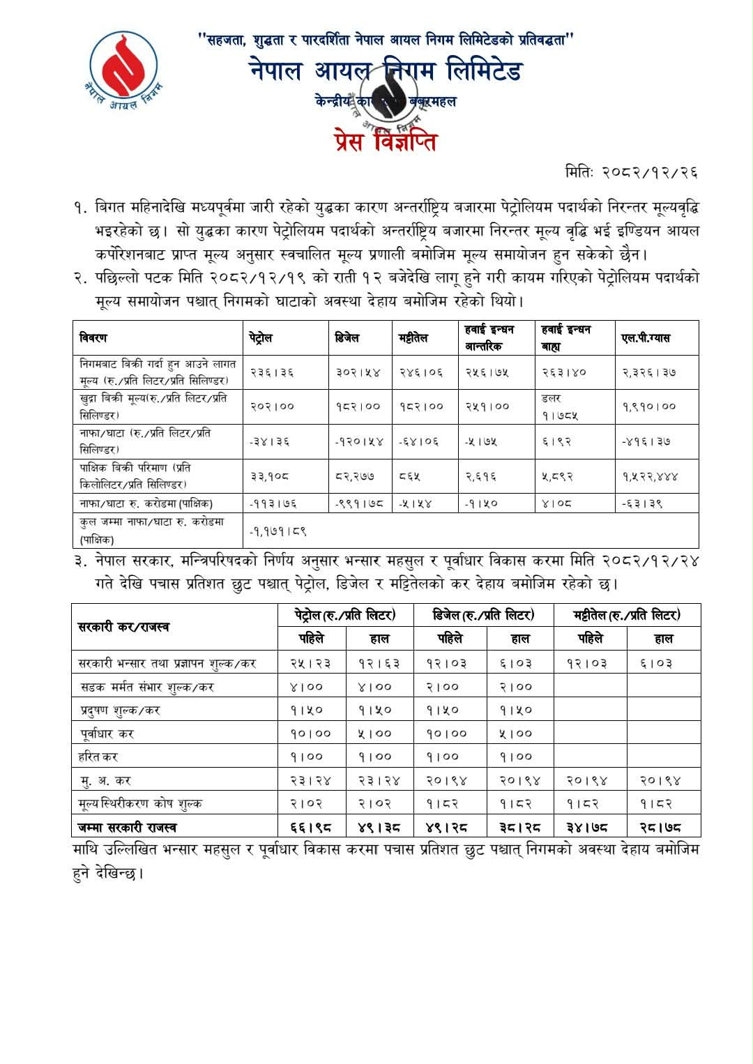 निगम सञ्चालक समितिको बैठकले प्रतिलिटर पेट्रोलमा १७ रुपैयाँ, डिजेल र मट्टीतेलमा २५/२५ रुपैयाँ प्रतिलिटर मूल्यवृद्धि गरेको हो ।