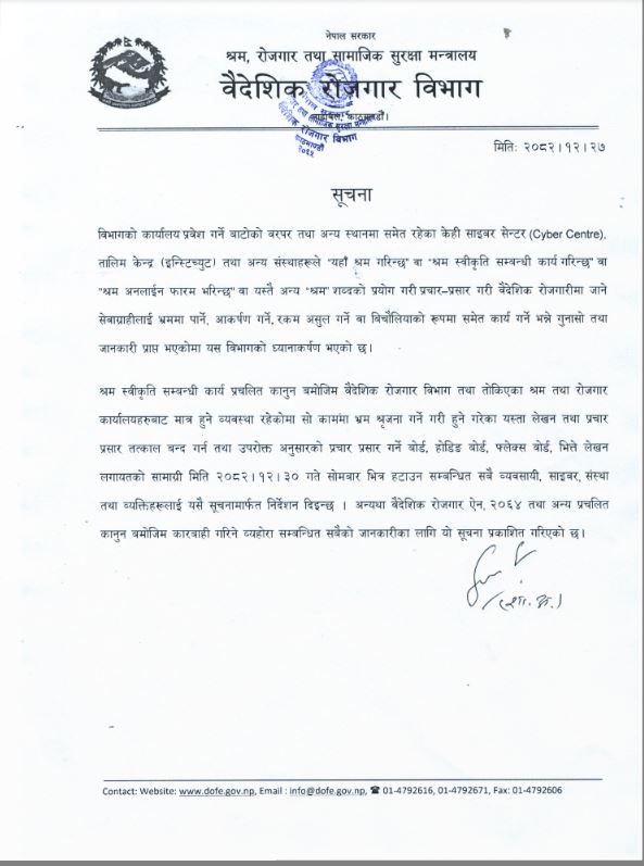 विभागको कार्यालय प्रवेश गर्ने बाटोको वरपर तथा अरू स्थानमा समेत रहेका केही साइबर सेन्टर, तालिम केन्द्र (इन्स्टिच्युट) र अन्य संस्थाले भ्रम सिर्जना गर्ने खालका होर्डिङ, फ्लेक्स बोर्ड राखेका सूचनामा उल्लेख छ । यस्ता सामग्रीले वैदेशिक रोजगारीमा जाने सेवाग्राहीलाई भ्रममा पार्ने, आकर्षण, रकम असुली वा बिचौलियाका रूपमा समेत कार्य गर्ने भन्ने गुनासो आएकाले ध्यानाकर्षण भएको विभागको सूचना उल्लेख छ ।