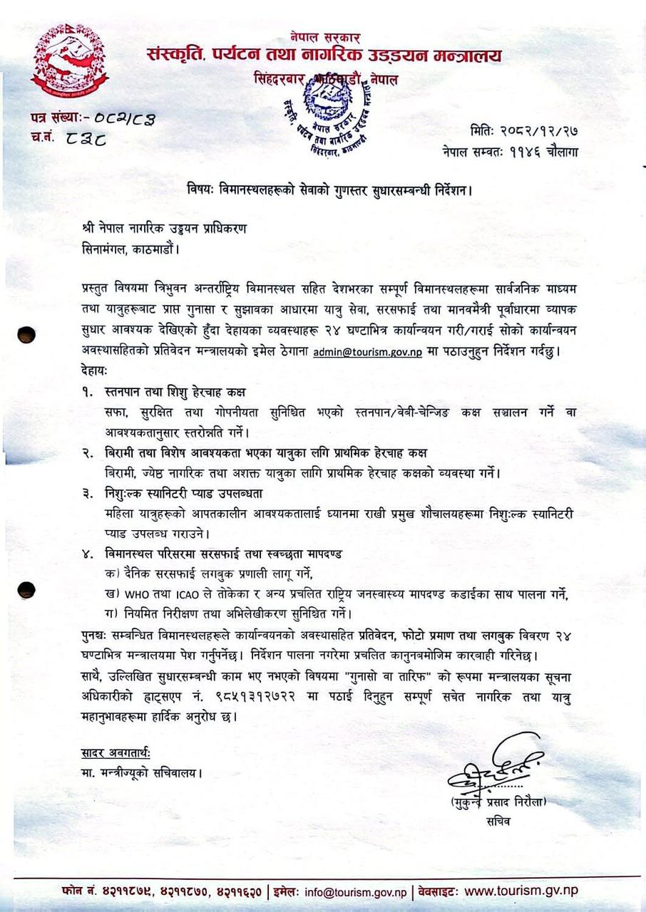 मन्त्रालयका सचिव मुकुन्द प्रसाद निरौलाको हस्ताक्षरमा जारी गुणस्तर सुधार सम्बन्धि निर्देशनमा देशभरका विमानस्थलहरूको सेवा गुणस्तर सुधार गर्न नागरिक उड्डयन प्राविधिकरणलाई निर्देशन जारी गरेको हो।