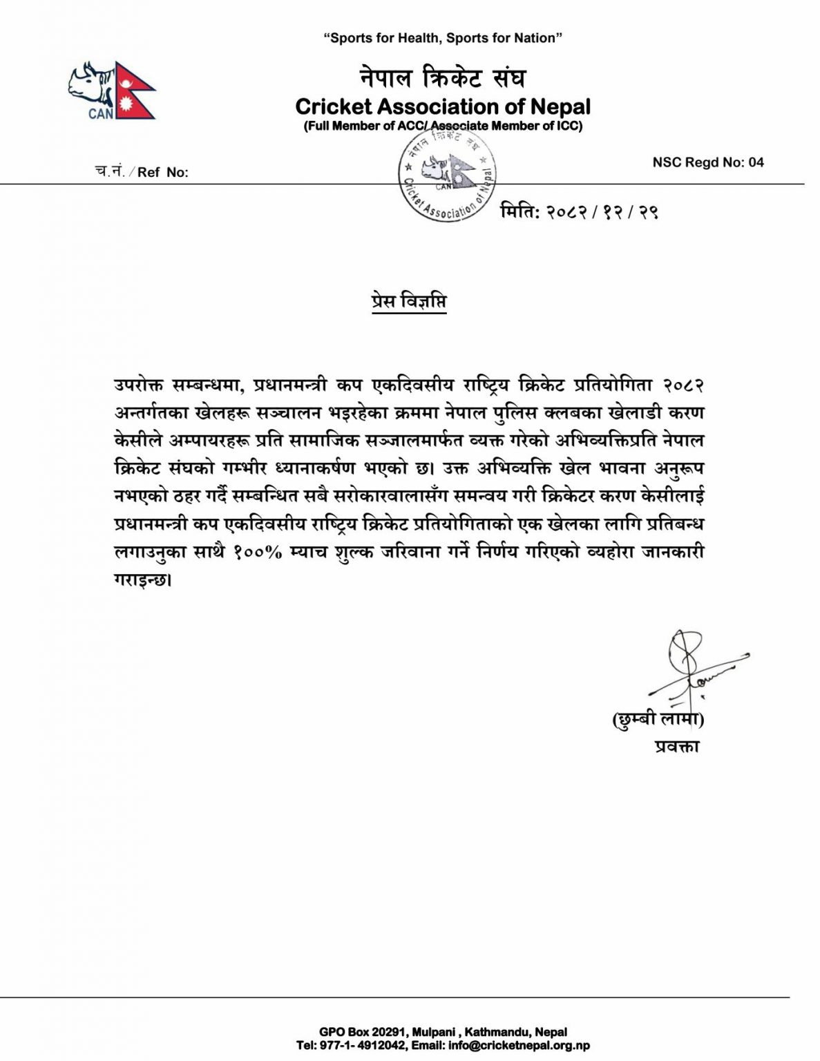 करणले पुलिस टीमबाट खेल्दै आएका छन् । आजको म्याचको म्याच फी पनि काटिएको छ । करणको अभिव्यक्ति खेल भावना अनुरूप नभएको क्यानको ठहर छ । प्रवक्ता छुम्बी लामाद्वारा जारी विज्ञप्तिमा उनलाई प्रधानमन्त्री कप राष्ट्रिय प्रतियोगिताको एक खेलमा प्रतिबन्ध लगाइएको साथै १०० प्रतिशत म्याच शुल्क जरिवाना गर्ने निर्णय भएको उल्लेख छ ।