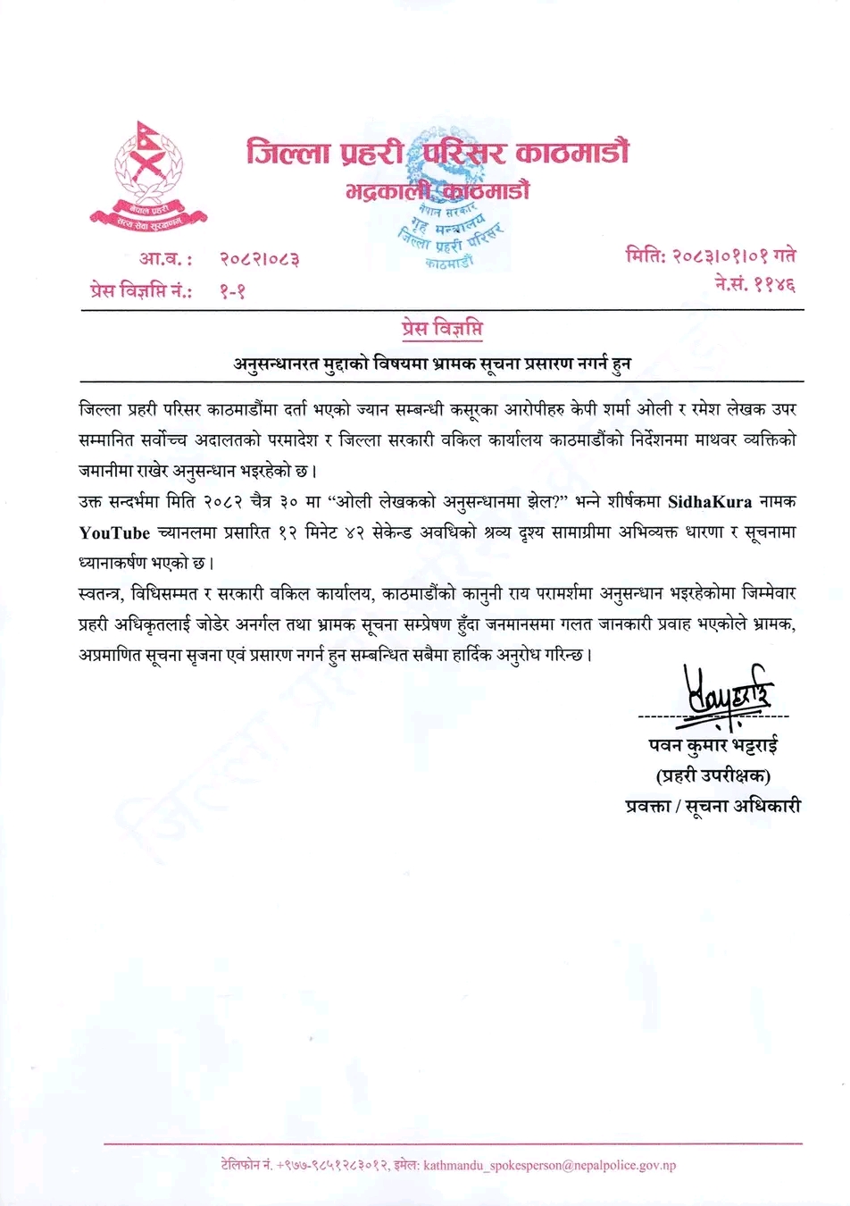 उनले आजै एक विज्ञप्ति जारी गरी ‘ओली–लेखकको अनुसन्धानमा झेल ?’ भन्ने शीर्षकमा एक युट्युब च्यानलमा श्रव्यदृश्य सामग्री प्रकाशन भएकाले त्यसमा अभिव्यक्त धारणा र सूचनामा ध्यानाकर्षण भएको जनाएका छन् ।
