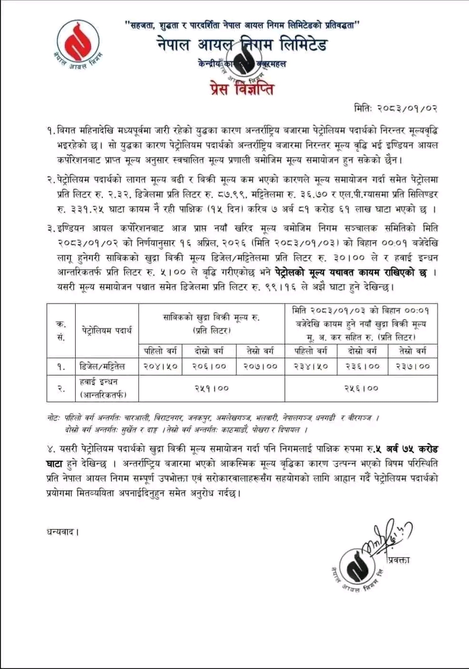 परिवर्तित मूल्यअनुसार, डिजल/मट्टीतेलको प्रतिलिटर २३७ रुपैयाँ पुगेको छ भने हवाई इन्धनको मूल्य प्रतिलिटर २५६ रुपैयाँ पुगेको छ । अन्तर्राष्ट्रिय बजारमा मूल्यवृद्धि भएको र इन्डियन आयल कर्पोरेसनले पठाएको नयाँ मूल्यसूचीअनुसार हिसाब गर्दा अझै अत्यधिक घाटा रहेको निगमको दाबी छ ।