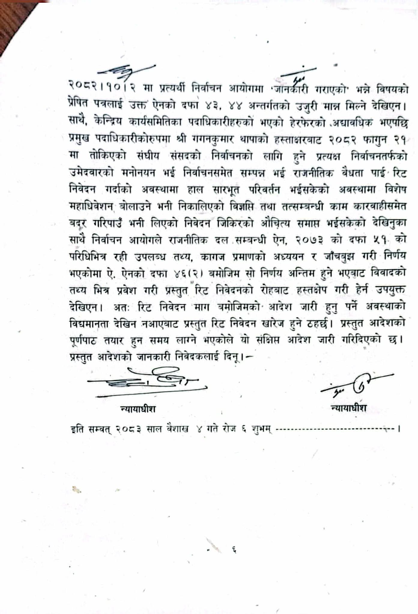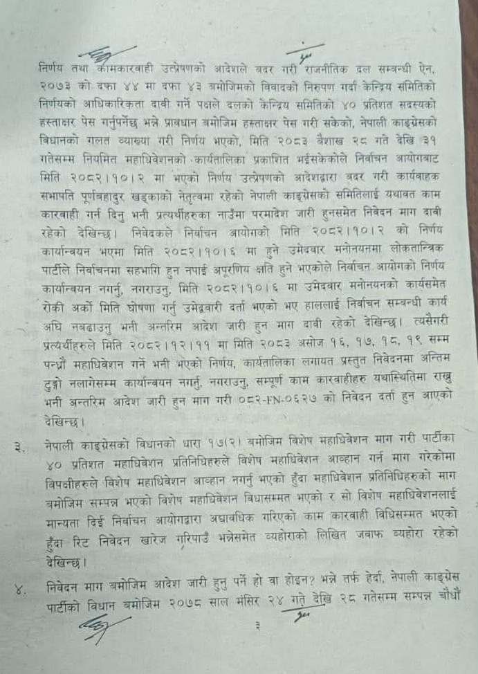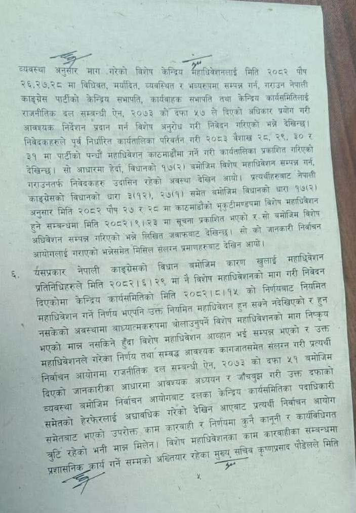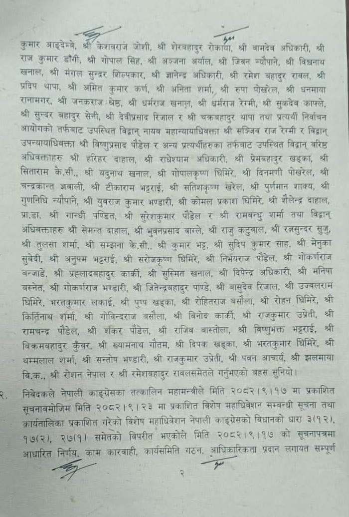 न्यायाधीशहरु शारंगा सुवेदी र नृपध्वज निरौलाको इजलासले नेपाली कांग्रेसको विशेष महाधिवेशनलाई आधिकारिकता दिने निर्वाचन आयोगको निर्णयलाई कानुनसम्म ठहर्याएको हो ।