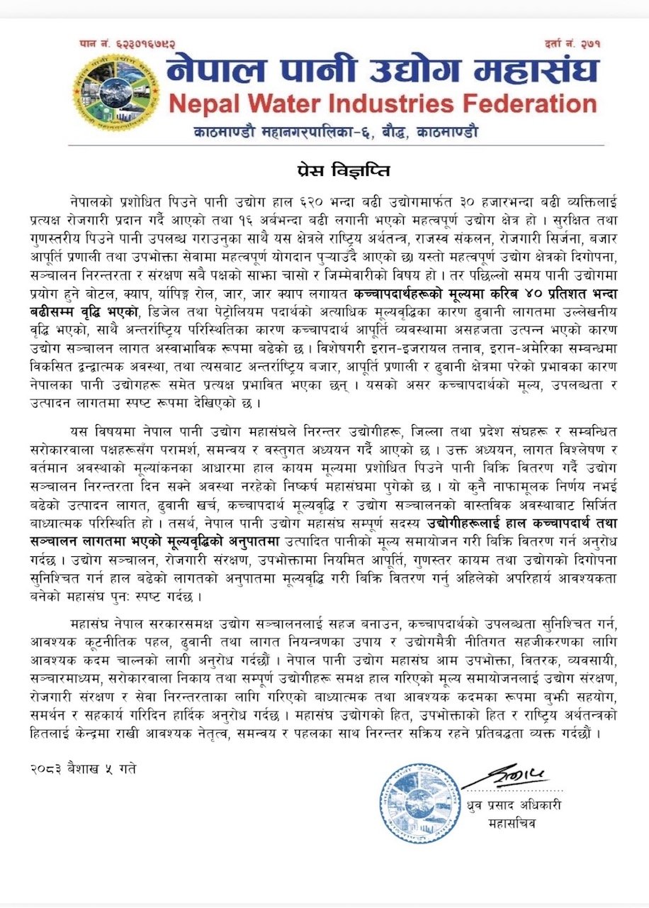 पछिल्लो समय विकसित अन्तर्राष्ट्रिय परिस्थिति, विशेषगरी इरान–इजरायल तनाव र इरान–अमेरिका सम्बन्धका कारण विश्व बजार र आपूर्ति प्रणालीमा परेको प्रभावले नेपालका पानी उद्योगहरू समेत प्रत्यक्ष प्रभावित भएको महासंघले उल्लेख गरेको छ ।