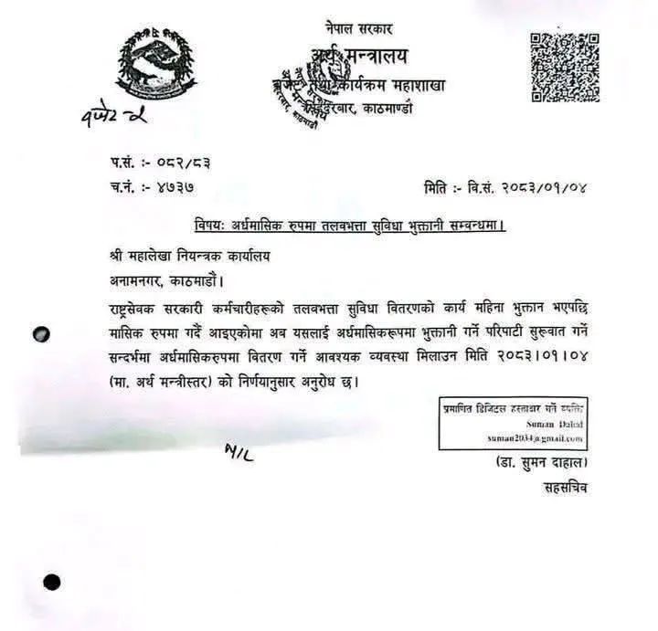 काठमाडौँ । सरकारले अबदेखि राष्ट्रसेवक कर्मचारीहरूलाई (अर्धमासिक) रुपमा तलबभत्ता उपलब्ध गराउने भएको छ । गत शुक्रबारको अर्थ मन्त्रालयको मन्त्रीस्तरीय निर्णयबाट महालेखा नियन्त्रक कार्यालयलाई आवश्यक व्यवस्था मिलाउन भनिसकिएको छ ।