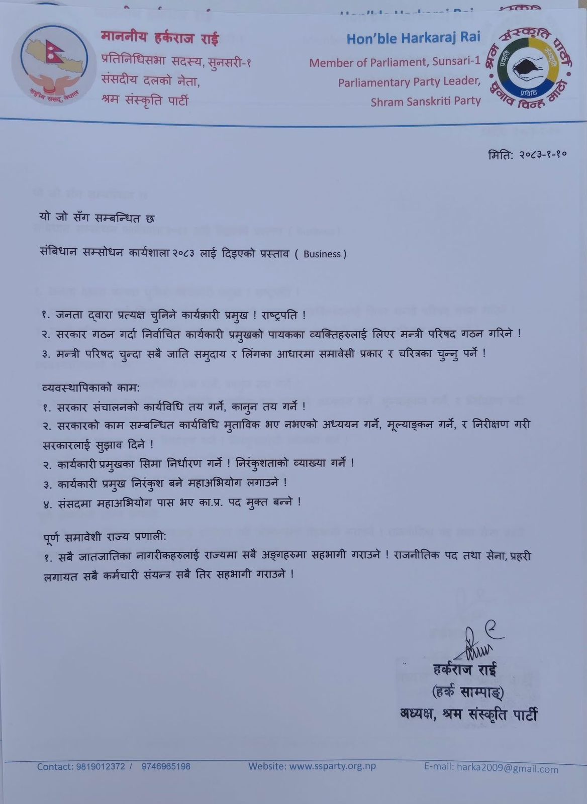 काठमाडौँ । श्रम संस्कृति पार्टीका अध्यक्ष हर्क साम्पाङ राईले संविधान संशोधनसम्बन्धी आफ्नो विस्तृत प्रस्ताव सार्वजनिक गरेका छन्।