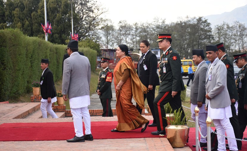 राष्ट्रपति नेतृत्वको प्रतिनिधिमण्डलमा महिला, बालबालिका तथा ज्येष्ठ नागरिकमन्त्री थममाया थापा, प्रतिनिधिसभा, महिला तथा सामाजिक समितिका सभापति निरुदेवी पाल, राष्ट्रपति कार्यालयका विज्ञ लक्ष्मीकुमारी कार्की, परराष्ट्र सचिव वैरागी, राष्ट्रपतिको कार्यालयका सचिव विनोद केसी, उद्योग, वाणिज्य तथा आपूर्ति मन्त्रालयका सचिव यामकुमारी खतिवडा तथा राष्ट्रपतिको कार्यालय, परराष्ट्र मन्त्रालय र महिला मन्त्रालयका वरिष्ठ अधिकारी सहभागी थिए।