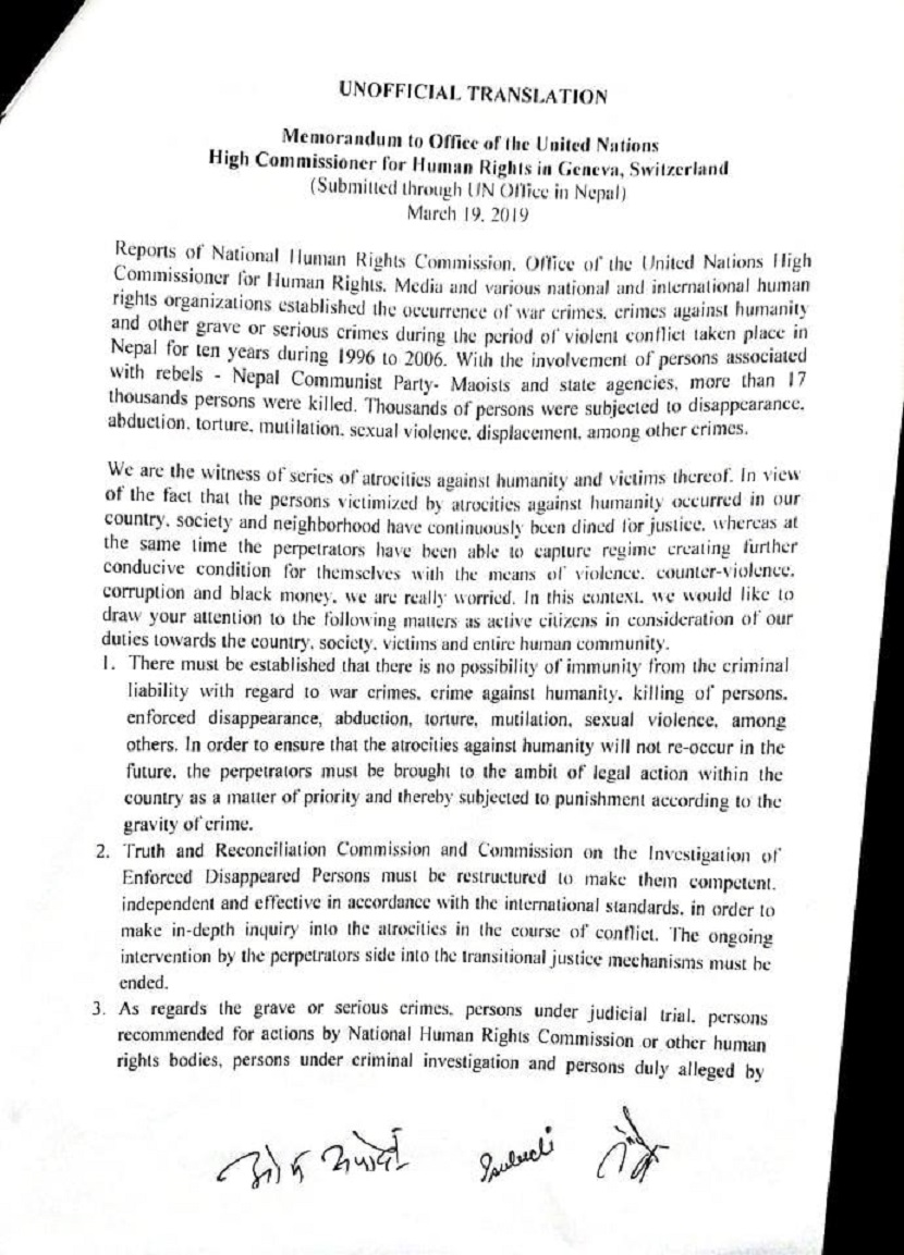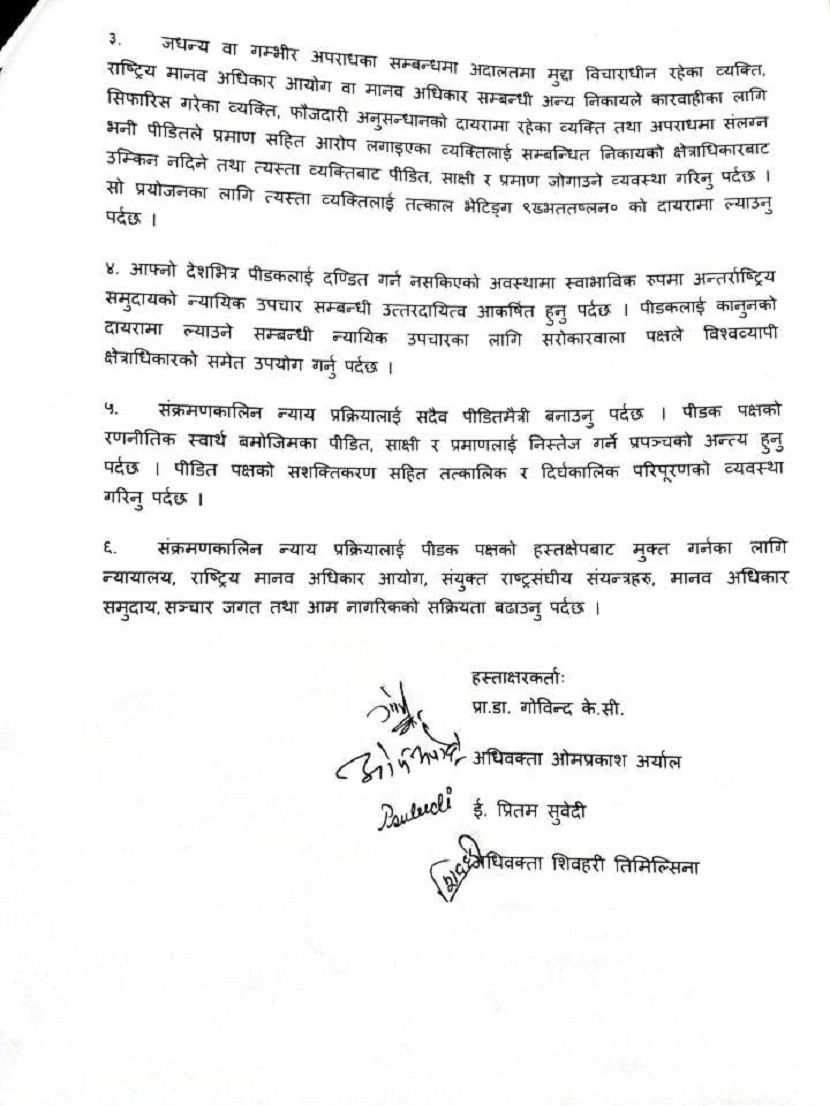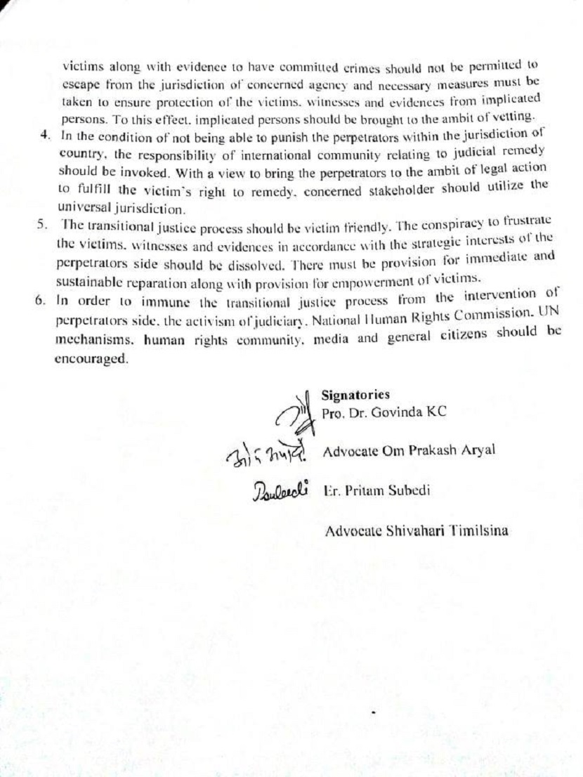 चिकित्सा शिक्षा अभियन्ता प्रा.डा. गोविन्द केसी, अधिवक्ता ओमप्रकाश अर्याल, इञ्जिनियर प्रितम सुवेदी, अधिवक्ता शिवहरी तिमिल्सिनाले संयुक्त रुपमा राष्ट्रिय मानव अधिकार आयोग र संयुक्त राष्ट्रसंघीय मानव अधिकार उच्चायुक्तको कार्यालय ज्ञापनपत्र बुझाएर २०५२ सालदेखि २०६३ सालसम्म चलेको १० वर्षे हिंसात्मक द्वन्द्वको अवधिमा युद्ध अपराध, मानवता विरुद्धका अपराध लगायत अन्य जधन्य वा गम्भीर अपराधका घटनामा संलग्नलाई कानुनी कारवाही गर्न माग गरेका हुन्।