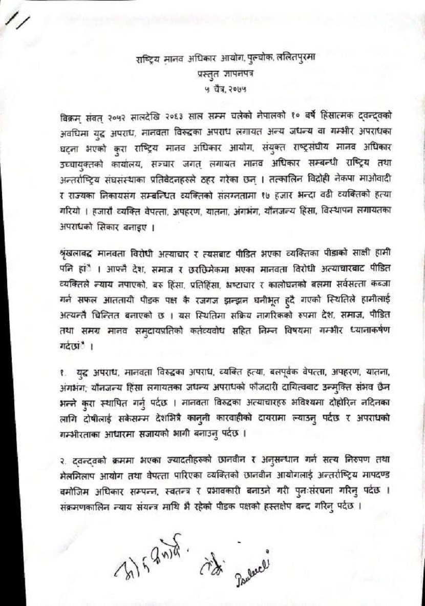 राष्ट्रिय मानव अधिकार आयोग, संयुक्त राष्ट्रसंघीय मानव अधिकार उच्चायुक्तको कार्यालय, सञ्चार जगत् लगायत मानव अधिकार सम्बन्धी राष्ट्रिय तथा अन्तर्राष्ट्रिय संघसंस्थाका प्रतिवेदनहरुले द्वन्द्वका क्रममा युद्ध अपराध र मानवविरुद्धका अपराध भएको ठहर गरेको उल्लेख गरिएको विज्ञप्तिमा भनिएको छ, ‘तत्कालिन विद्रोही नेकपा माओवादी र राज्यका निकायसँग सम्बन्धित व्यक्तिको संलग्नतामा १७ हजारभन्दा बढी व्यक्तिको हत्या गरियो। हजारौं व्यक्ति बेपत्ता, अपहरण, यातना, अंगभंग, यौनजन्य हिंसा, विस्थापन लगायतका अपराधको सिकार बनाइए।’