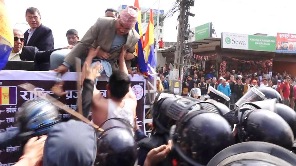 यस्तै भयो सोमबार हिन्दुराष्ट्र र राजतन्त्रको पुनः स्थापनाको माग राख्दै राप्रपाको सडक आन्दोलनमा। पञ्चायतको अन्तीम समय २०४५ सालमा सञ्चारमन्त्री रहेका कमल थापाको जुलुसमाथि सोमबार प्रहरीले दरो लाठी चार्ज गर्यो।
