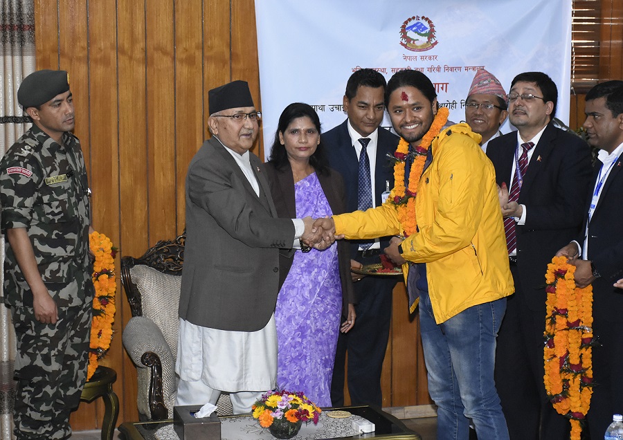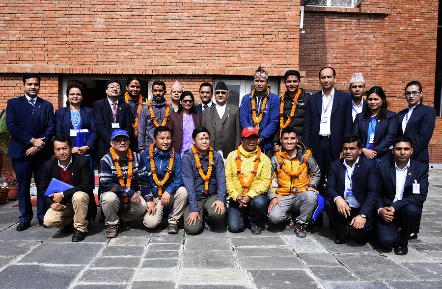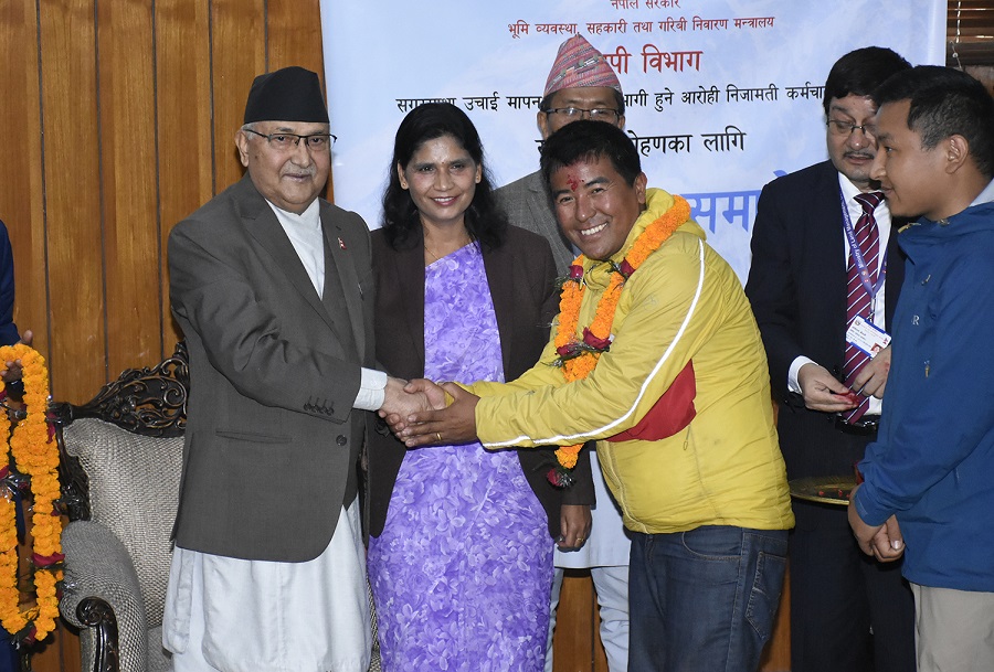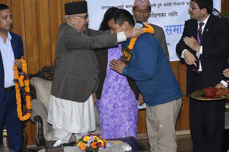 काठमाडौँ – प्रधानमन्त्री केपी शर्मा ओलीले सगरमाथाको उचाइ मापन गर्न जाने नेपाली टोलीलाई आज एक कार्यक्रम गरी बिदाई गरेका छन्। बालुवाटारमा आयोजित कार्यक्रममा प्रधानमन्त्रीले टोलीलाई माला र टीका लगाएर बिदाई गरे।
