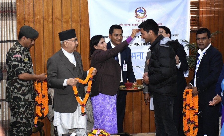 प्रधानमन्त्रीले आरोहण कार्य चुनौतीपूर्ण रहेकाले मौसम र स्वास्थ्यको अनुकूलतामा सावधानी अपनाएर अगाडि बढ्न आरोहण टोलीलाई सुझाव दिए।
