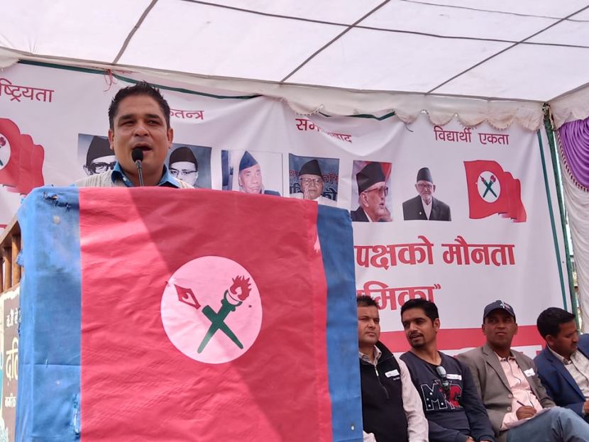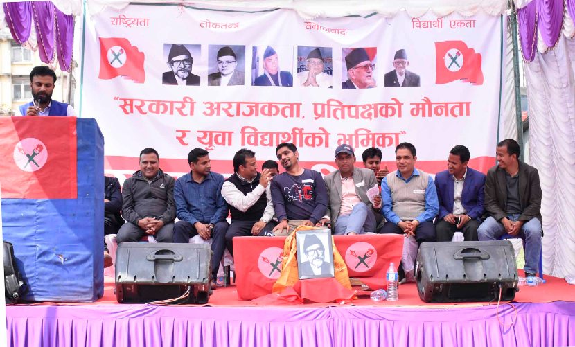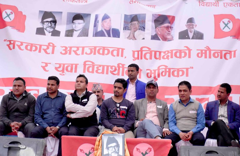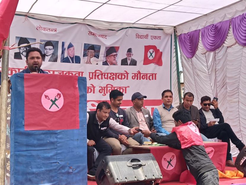 काठमाडौं – दुईतिहाइको सरकार गठन भएको एक वर्ष पुगिसक्दा पनि जनताको भावनाअनुरूप काम गर्न नसकेको त्यसमा प्रतिपक्षी दल कांग्रेसले मौनता देखाएको उल्लेख गर्दै नेपाल विद्यार्थी संघले शुक्रबार काठमाडौंमा खबरदारी सभा गरेको छ।