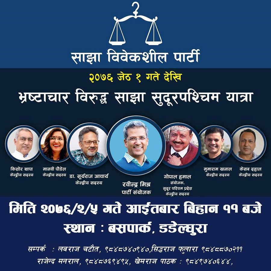 गाउँगाउँमा भइरहेको भ्रष्टाचारबा विरुद्व आम नागरिकलाई जागरुक बनाउनका लागि उक्त पार्टीले ‘भ्रष्टाचार विरुद्व साझा सुदूरपश्चिम यात्रा’ सञ्चालन गरेको जनाएको छ।