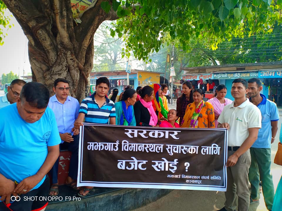 शुक्रबार कन्चनपुरका स्थानीयले ‘मझगाँउ विमानस्थललाई बजेट खोई’ भन्दै महेन्द्रनगर बजारमा विरोध र्याली निकालिएको छ। चुनावको बेलामा मझगाँउ विमानस्थल संचालन गर्ने बाचा गरे पनि कुनै पनि नेताले चुनाव जीतेपछि चुनावी नारालाई भुलेको भन्दै स्थानीयले दबाबमूलक प्रदर्शन गरिएको संघर्ष समितिका सदस्य चन्द्रदेव बडुले बताए।