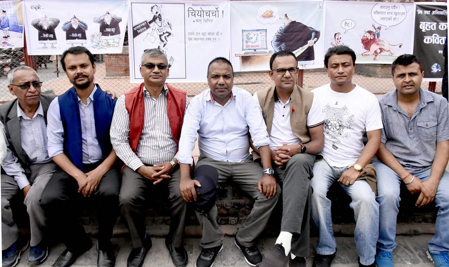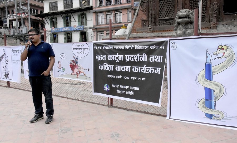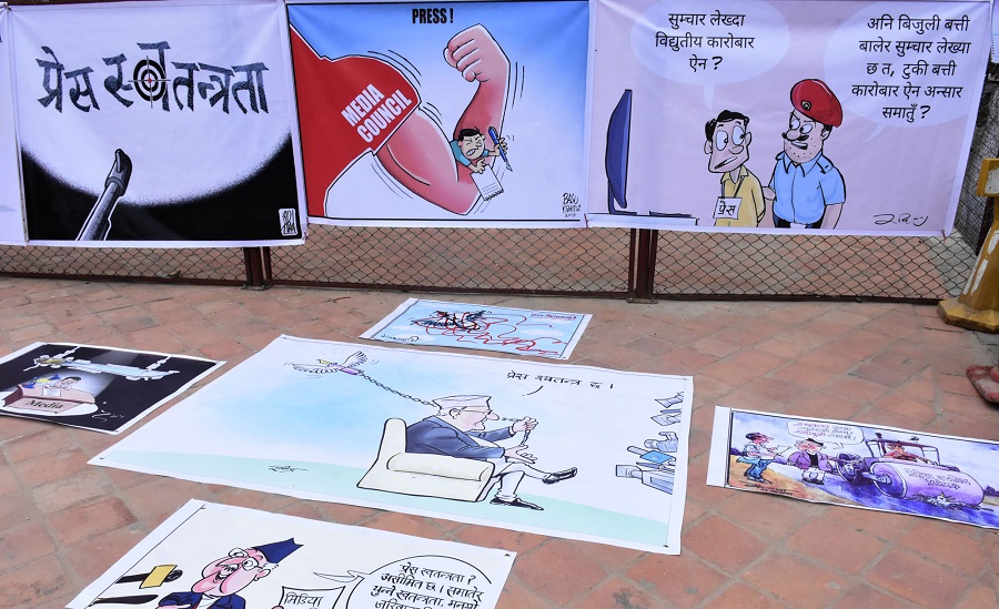 काठमाडौँ – सरकारले ल्याउन लागेको मिडिया काउन्सिलसम्बन्धी विधेयकविरुद्ध पत्रकार महासंघका आन्दोलनका कार्यक्रम जारी छन्। आन्दोलनका कार्यक्रमअन्तर्गत बृहत कार्टुन प्रदर्शनी तथा कविता वाचन कार्यक्रम गरिएको छ।