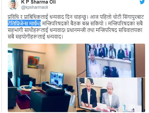 स्वास्थ्यपोचारका लागि सिंगापुर गएका ओलीले आज भिडिओ कन्फेरेन्समार्फत् आफूले विदेशबाट बैठकमा सहभागी हुन पाएकोमा प्रविधि र प्राविधिकलाई धन्यवाद समेत दिएका छन्।
