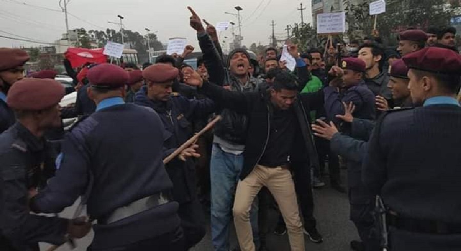 काठमाडौँ, ८ माघ – संसद भवन अगाडि प्रदर्शनमा उत्रिएका नेवि संघका नेता–कार्यकर्तामाथि प्रहरीले ज्यादती गरेको छ। प्रहरी दमनमा महामन्त्रीसहितका केन्द्रीय नेताहरु घाइते भएका छन्।