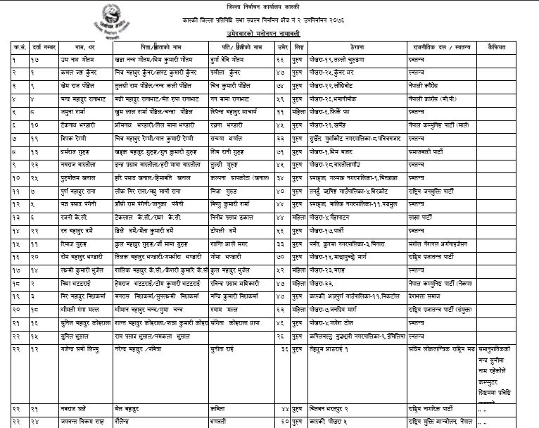यस्तै, नेपाली कांग्रेस (बीपी) बाट चन्द्रबहादुर रानाभाट, नेपाल कम्युनिस्ट पार्टी (माले) बाट टेकनाथ भण्डारी, राष्ट्रिय जनमुक्ति पार्टीबाट पूर्णबहादुर राना, साझा पार्टीबाट रजनी केसी, मंगोल नेशनल अर्गनाइजेसनबाट रियाज गुरुङ, राष्ट्रिय प्रजातन्त्र पार्टीबाट रोमबहादुर भण्डारी, देशभक्त समाजबाट विरबहादुर विश्वकर्मा र राष्ट्रिय प्रजातन्त्र पार्टी (संयुक्त) बाट गंगा मल्लले उम्मेदवारी दिएका छन्।